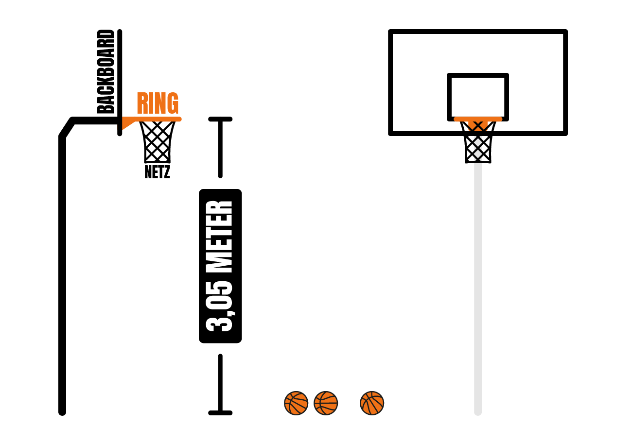 Der Korb besteht aus einem orangefarbenen Metallring, der auf einer Höhe von 3,05 Meter an einem Brett aus Sicherheitsglas oder Holz angebracht ist. Der Ring hat einen Durchmesser von 45 cm, an dem ein Netz befestigt ist, das den Ball kurzzeitig hemmt, wenn er durch den Ring geworfen wird.