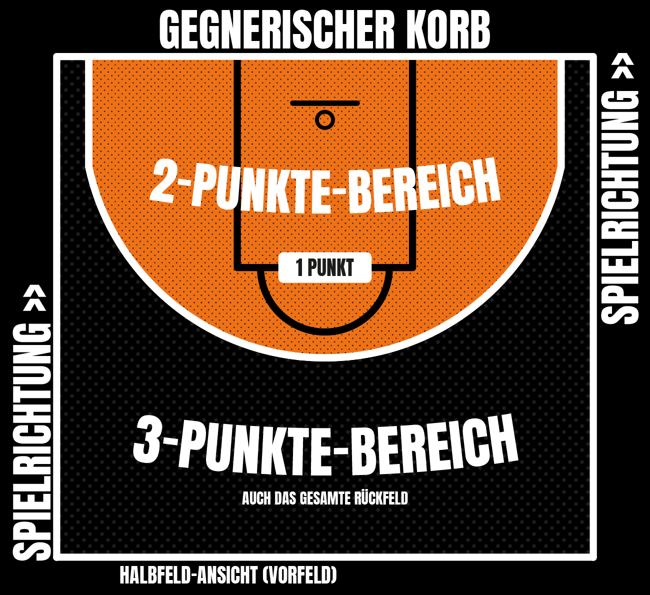 Die Spielfeldhälfte, in der der eigene Korb steht, ist das Rückfeld und die andere Hälfte des Gegners ist das Vorfeld. Nach der Halbzeit werden die Seiten gewechselt.